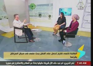 واكدت الدكتورة ريهام محسن ان كلية التكنولوجيا الحيوية هى كلية وحيدة فى مصر ومنطقة الشرق الاوسط ويدرسون ست مواد حيوية خاصة بالطب والصيدلة والزراعة ويطلب من الطلبة تقديم بحوث علمية فى سنوات الدراسة وللتخرج مما يحثهم على التعامل مع الجامعات المصرية والاجنبية لاكمال البحوث الخاصة بهم واكدت ان بحث نانسى فكرة مبدأية جيدا جدا تحتاج للتطبيق بعد العمل واكدت ان البحث العلمى فى مصر يحتاج لتمويل وتبنى جهات هذا التمويل لزيادة الابحاث فى مجالات متخصصة وتطبيقها على النطاق العلمى على الانسان